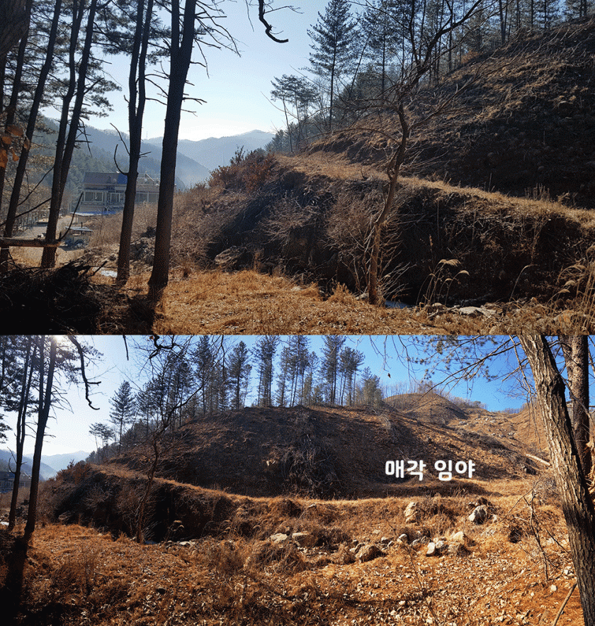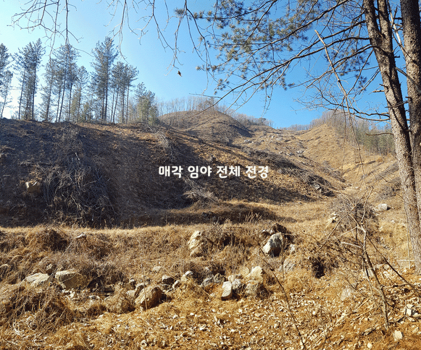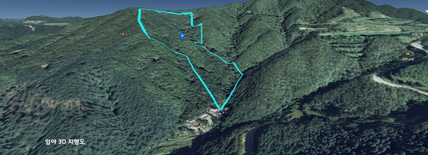 임야의 앞 부분은 비교적 완만하고 뒤로 갈수록 경사가 급해지는 형태입니다.