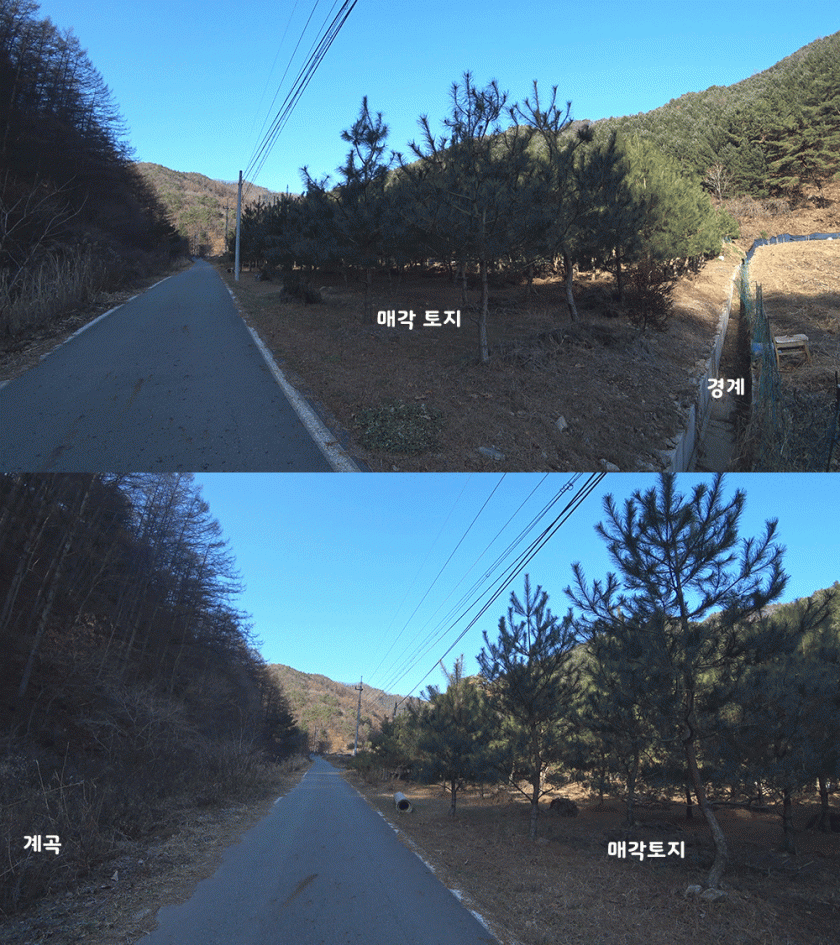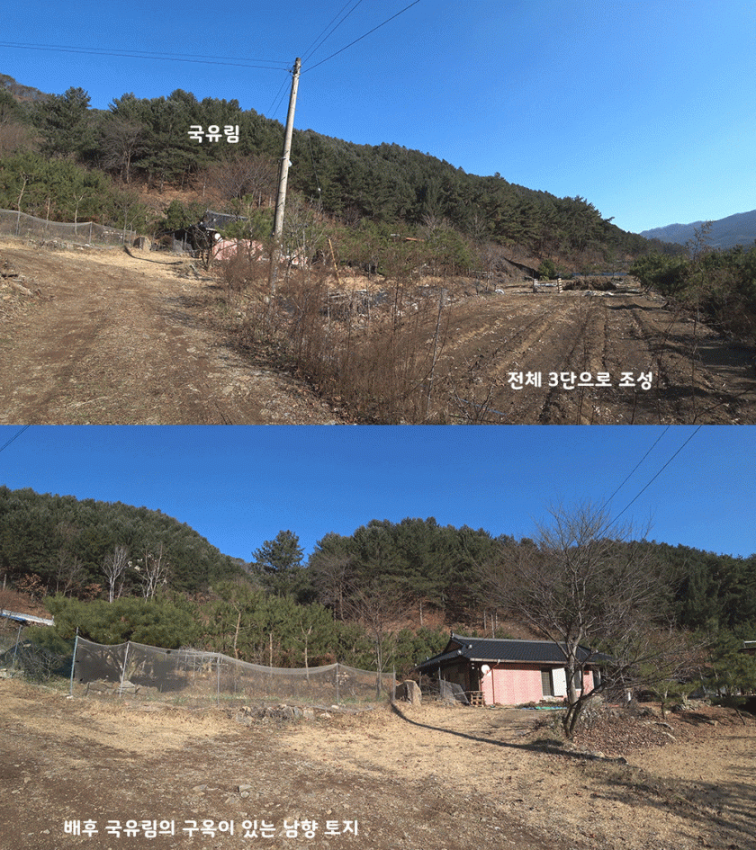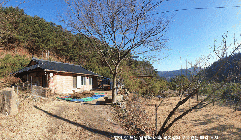 구옥 뒤쪽인 매각 토지의 북쪽으로 국유림이 둘러싸고 있고 토지 아래의 남쪽으로 도로를 사이에 두고 계곡이 인접해 있으며 동쪽으로 탁 트인 전망이 좋은 토지입니다.