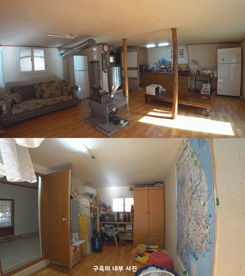 난방은 아궁이 온돌방과 전기 판넬로 되어 있고 거실과 주방 공간에는 별도의 난방 없이 난로가 설치되어 있습니다.