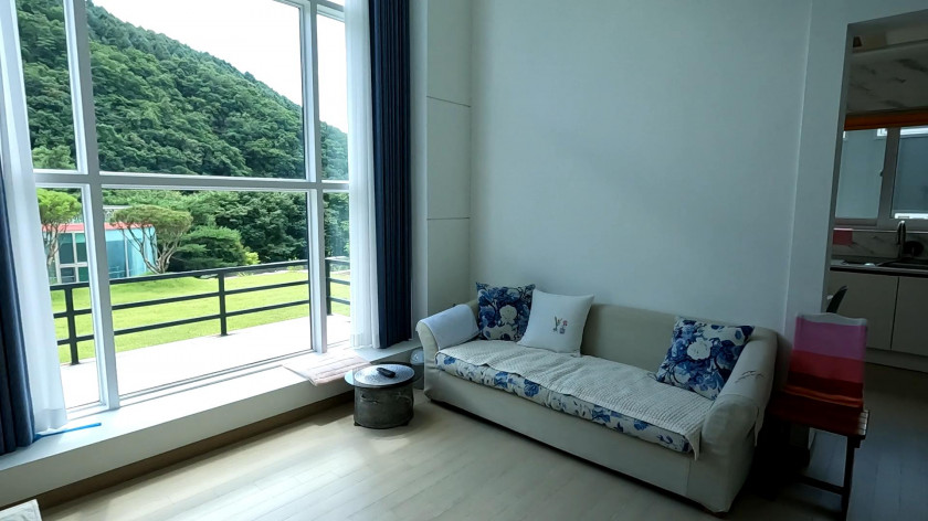 내부는 방 2, 화장실 2, 거실, 주방, 다용도실로 구성되어 있고, 거실의 천장고가 높고 강 조망과 기암괴석의 멋진 절경을 집 내부에서 볼 수 있도록 거실 창을 크게 시공하였습니다.