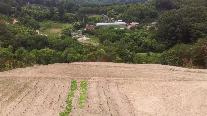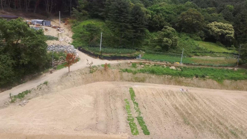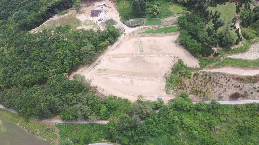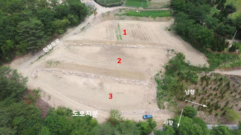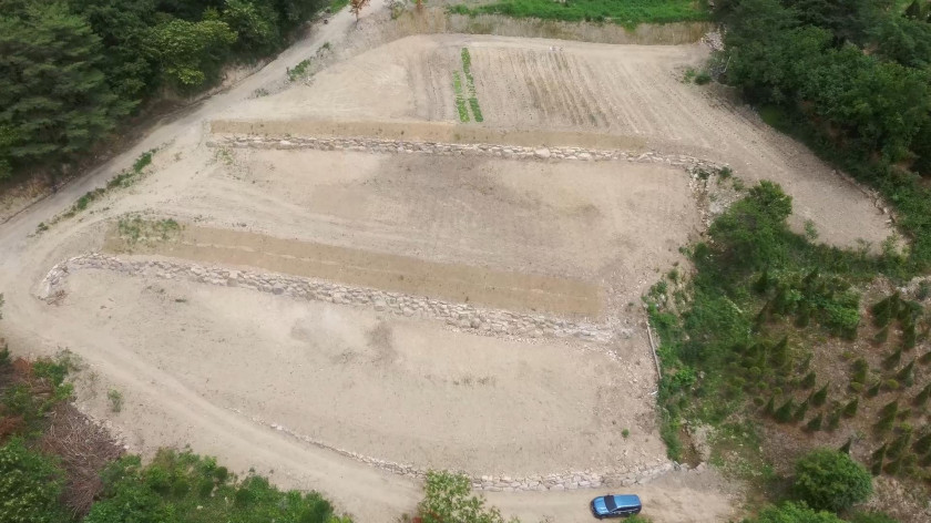 토지는 전체 3단으로 조성이 되어 있고, 석축공사와 토지 평탄 작업이 완료되어 있음