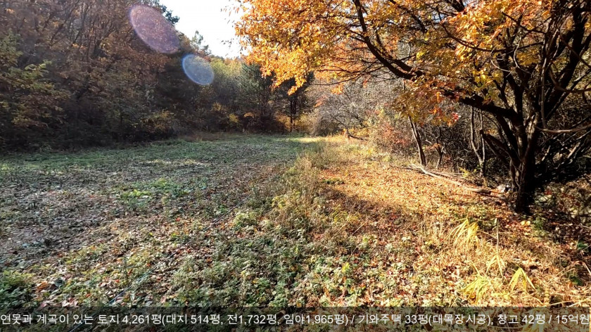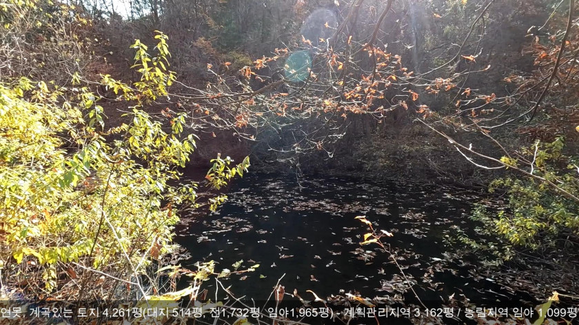 경사도 없이 진출입이 용이하면서 배후 임야에 둘러싸여 오염요소 전혀 없는 맑은 물이 흐르고 산 아래쪽 끝 토지에 작은 연못(저수지)도 있습니다.