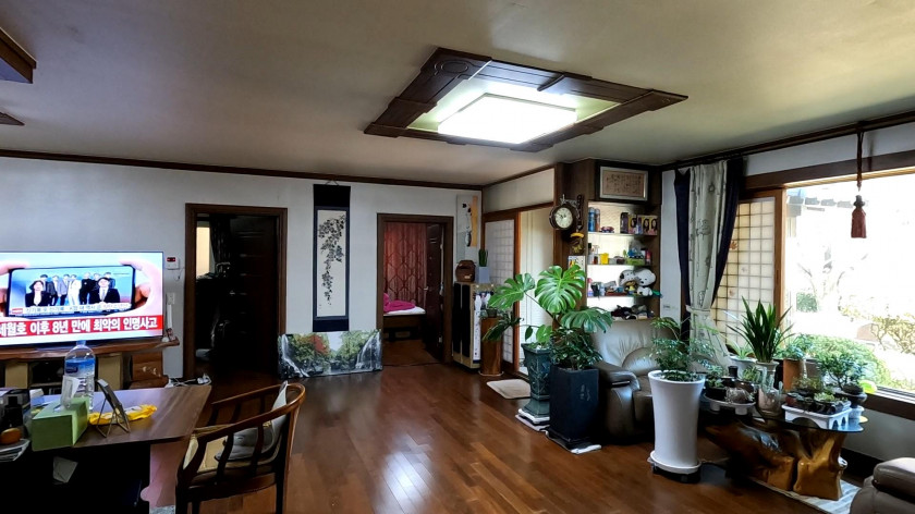 대목장이 전통기와를 올려 리모델링한 33평의 세월이 흔적이 묻어있는 소박하고 아늑한 거실이 있는 주택.