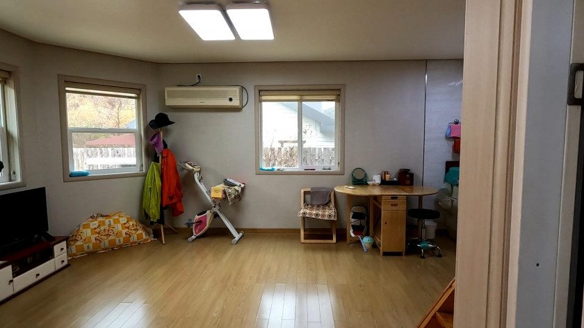 1층은 22평으로 방 2(안방은 아궁이 찜질 및 기름보일러 겸용, 작은방은 전기 필름), 화장실 1, 거실 및 주방, 다용도실로 되어 있고,