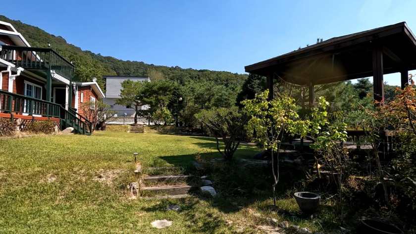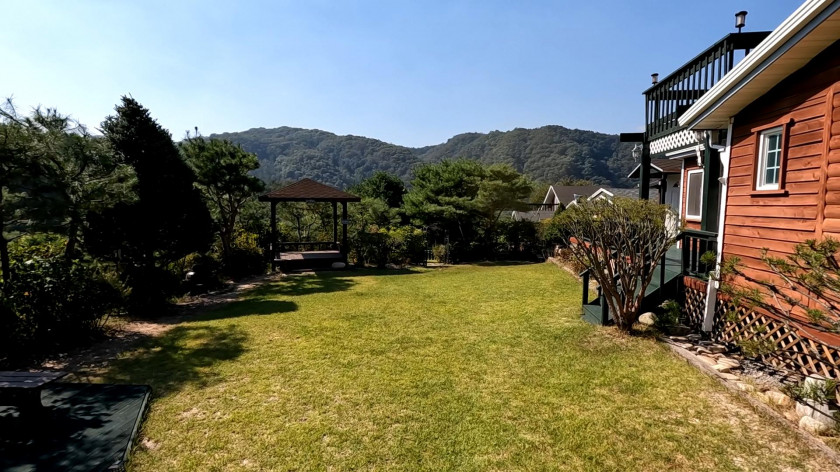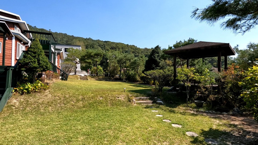 매매 주택의 앞 마당에는 잘 관리된 조경수와 이쁜 잔디정원이 형성되어 있고, 큰 정자도 설치되어 있습니다.