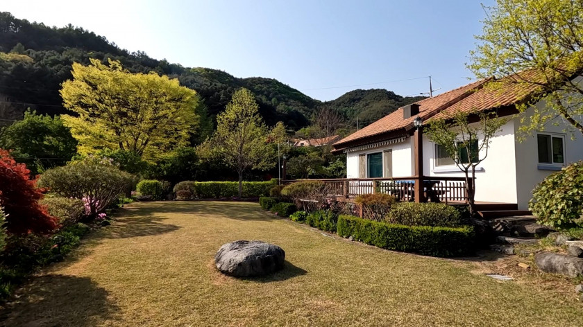 강원도 홍천 수타사 및 공작산 인근의 공기 좋은 조경과 잔디정원이 잘 관리된 잘 지은 전원주택