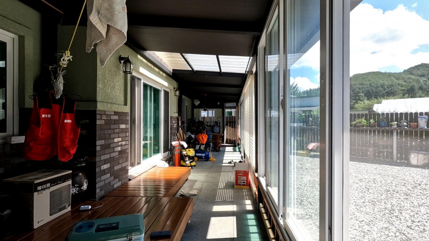 바닥은 데크가 아닌 콘크리트를 타설 한 후 관리할 것이 없는 판석으로 시공하였고, 앞쪽 전체가 샷시로 설치되어 있으며, 지붕은 단열재 판넬로 시공하여 여름철에도 뜨겁지 않고 시원하게 공간을 활용할 수 있습니다.