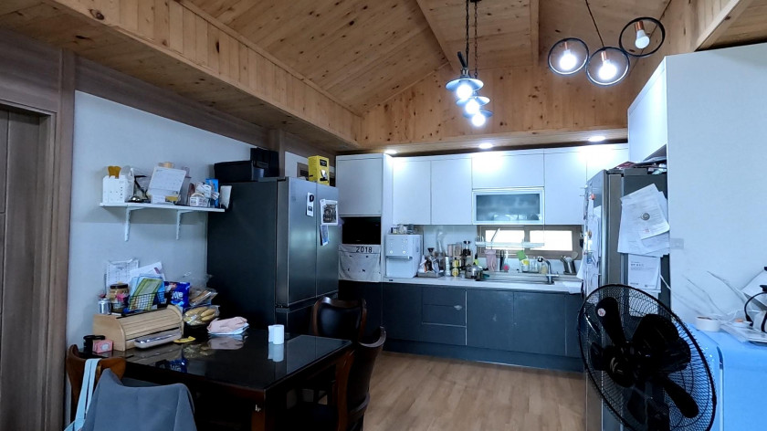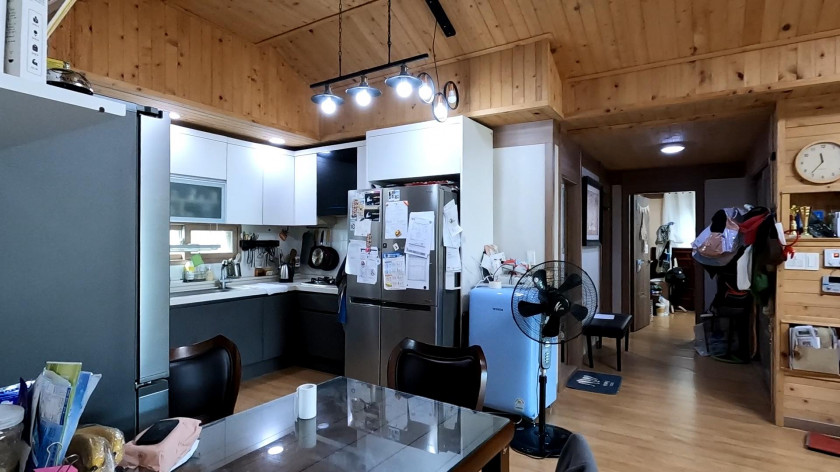 주택은 30평으로 방 3, 화장실 2, 거실, 주방, 다용도실로 되어 있고, 난방은 기름보일러 및 화목보일러 겸용이며, 급수는 지하수를 사용하고 있습니다. 내부는 4인 가족이 거주하기에 문제가 없도록 공간이 구성되어 있습니다.