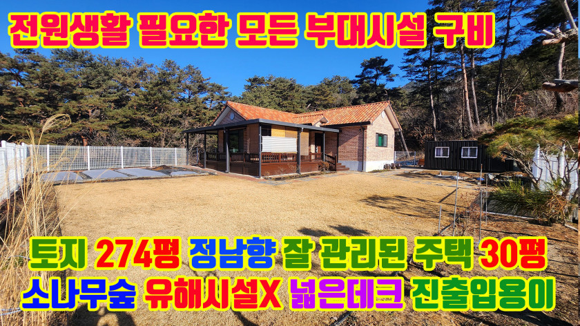 1. 기본 소개 소재지 : 강원특별자치도 홍천군 홍천읍 삼마치리 토지 면적 : 907.25㎡(274평) 토지 지목 : 대지(225평), 도로 지분(49평) 토지 용도 : 계획관리지역 토지 방향 : 정남향 진입 도로 : 아스팔트 포장된 교행이 가능한 지적상 도로에 접함 주택 면적 : 99.97㎡(30평) 주택 구조 : 경량철골구조(벽돌 마감, 기와지붕, 내진설계) 준공 일자 : 2020년 2월 5일 난방 급수 : 기름보일러 / 마을 상수도 (지하수도 설치되어 있음) 주택 방향 : 정남향(거실 및 출입구 기준) 내부 구조 : 방 2, 화장실 2, 거실, 주방, 다용도실 부대 시설 : 넓은 잔디정원, 컨테이너 창고 1동, 다용도 창고 1동, 처마가 있는 넓은 데크, 휀스와 대문 설치됨 매매 금액 : 3억원(금액 조율 불가) - 공시지가 2억 이내로 다주택자 취득세 중과없고 법인 취득세 중과없음 2. 접근성 및 주변 환경 서울 잠실에서 약 1시간 15분(98km) 중앙고속도로 홍천 IC에서 약 12분 시외버스터미널, 마트, 학교, 종합병원 등이 있는 홍천 중심 시내에서 약 10분 도보 5분 거리 버스정류장 국도에서 500m 안쪽을 잘 포장된 교행 가능한 도로를 통해 진입하여 진출입이 매우 용이함 주변에 축사나 송전탑과 같은 유해시설은 없음 주변은 외지인들로 형성도 4~6가구가 있는 마을에 위치함 주변은 소나무가 있는 나지막한 임야로 둘러싸여 아늑하고 조용함 전기나 통신이 모두 지중화되어 있어서 마을이 깔끔함 3. 토지 상세 토지는 전체 274평 중 경사면 유실 없는 대지가 225평이 있고, 도로 지분이 49평이 있는데 마을의 마지막에 위치하여 도로변에 주차가 가능하므로 도로 지분을 주차공간으로 활용이 가능함. 대지는 깔끔한 사각형의 형태로 반듯하여 토지 활용도가 매우 좋음. 인접한 임야의 일부를 추가로 텃밭으로 사용하고 있어서 토지가 더 넓게 보임 토지에서 보이는 경치가 좋고, 시내에 멀지 않으면서도 자연을 즐기기 매우 좋은 위치임 토지의 경계를 따라 휀스가 모두 설치되어 있고, 대형견을 키울 수 있도록 높이가 있어서 반려견과 아이들이 안전하게 전원생활을 즐기기 좋음 4. 주택 상세 주택은 내진설계가 되어 있어서 기초가 매우 튼튼하게 설치되어 있음. 관리하기 좋고 내구성이 좋은 벽돌과 기와지붕으로 외부 마감이 되어 있고, 외부의 조경이나 잔디정원, 텃밭이 관리가 잘 되어 있음 잡초관리를 최소화할 수 있도록 건물 뒤쪽이나 옆쪽에 바닥 콘크리트 시공이 되어 있고, 마을의 마지막에 위치하여 아늑하고 독립적임. 주택의 앞쪽과 옆면 모두 데크와 처마가 설치되어 있고, 데크 관리가 매우 잘 되어 있음 그리고 처마는 단열이 되는 판넬 재질을 사용하여 여름철에도 처마 아래가 뜨겁지 않고, 비가 오거나 눈이 와도 걱정하지 않고 야외 생활을 즐길 수 있음. 내부의 방 2개는 모두 붙박이장이 설치되어 있으며, 주방의 다용도 공간은 넓고 길게 배치를 하여 활용도가 좋음. 전체적으로 방과 거실, 화장실이 크게 구성되어 되어 내부가 답답하지 않고, 거실과 연결된 외부 데크가 넓어서 주택의 활용도가 좋음 5. 참고 사항 더 이상 부대시설이나 조경 비용 등을 추가로 설치할 것이 없는 전원생활에 최적화된 주택 매물입니다. 주인분이 너무나 깔끔하게 잘 관리를 하셨고, 정남향으로 볕이 잘 드는 소나무 숲에 둘러싸인 자연환경 좋은 홍천 전원주택입니다. 특히 진출입이 너무 편하고, 시내와 가까우며, 서울과의 접근성이 좋아서 어중간한 양평 전원주택보다는 생활환경이나 교통이 편하실 것입니다. 다음은 동영상 설명입니다. https://youtu.be/E4HaD-hxrCs |
