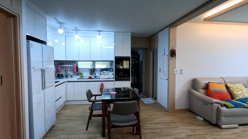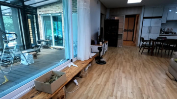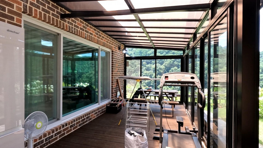 거실과 연결되어 넓은 썬룸공간이 거실 창 앞에 전체 창호로 설치되어 있고, 현관문을 열면, 본체로 들어가기 전 손님 맞는 전실로 사용할 수 있는 넓은 공간이 있습니다.