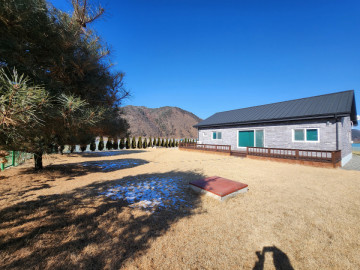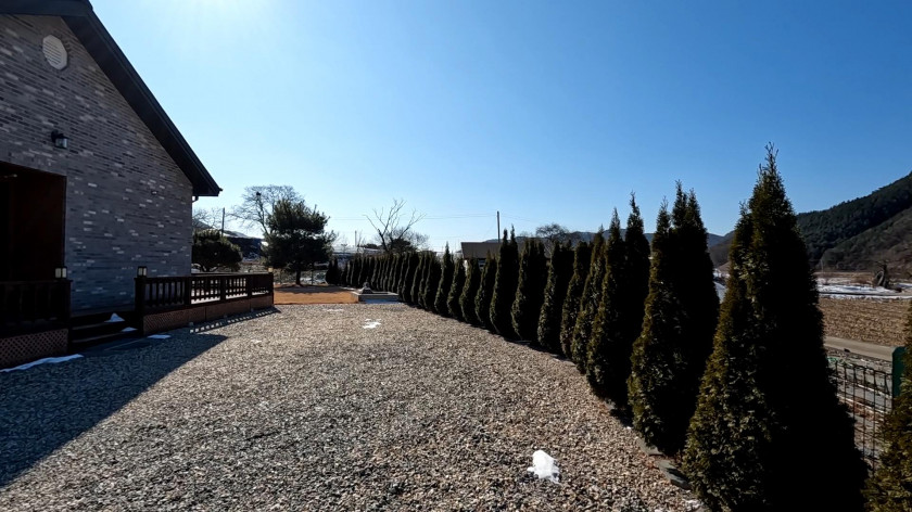 주택을 둘러싸서 잡석이 잘 시공되어 있어서 잡풀 관리가 필요없고, 거실앞쪽은 넓은 잔디와 소나무조경이 식재되어 있어서 반려견과 아이들이 놀기 좋음.
