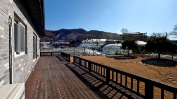거실과 현관문 앞쪽 전체가 데크가 설치되어 있고, 주택 뒤쪽으로 바닥 콘크리트가 타설된 경량철골구조의 지붕이 있는 주차공간이 별도로 있음