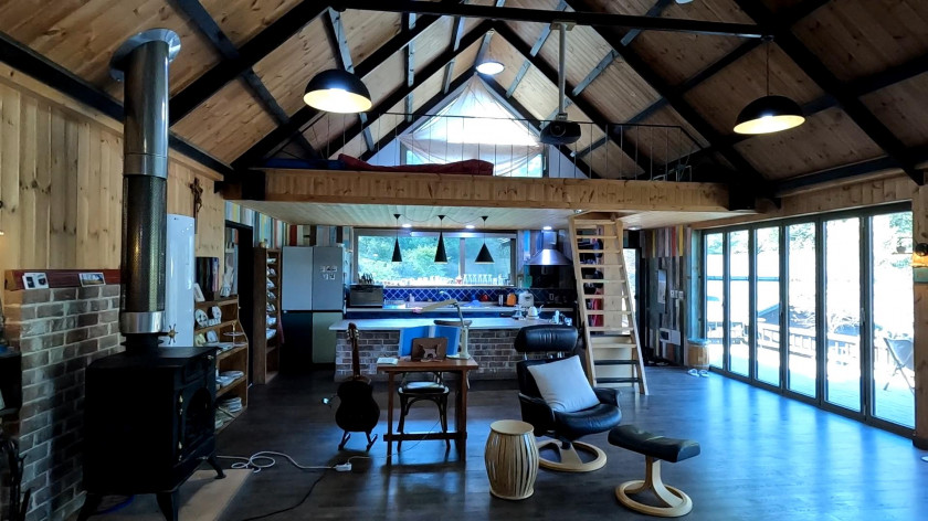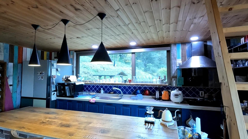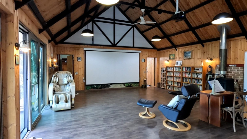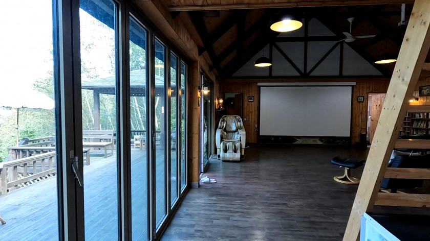 내부는 1층은 21평으로 넓은 거실과 주방, 화장실 1개로 되어 있고, 한쪽 면을 통창과 폴딩도어를 설치하여 여름철에는 외부의 넓은 데크공간과 연결하여 파티를 즐기기 좋고, 거실에는 벽난로와 빔프로젝터가 설치되어 있습니다.